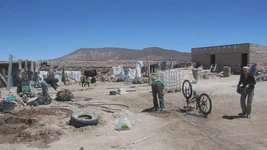 En fin d’après-midi, nous arrivons enfin à San Juan. On s’attend à trouver un petit village sympa, c’est un village de Far-West, presque fantôme. Tous les habitants sont calfeutrés chez eux, on dirait que tout le monde a déserté… Nous trouvons finalement un hôtel… de sel ! On savait que cela existait mais on ignorait qu’il y en a un ici, et surtout qu’il n’est pas complètement hors budget pour nos bourses de cyclistes fauchés ! Que bueno ! Comme vous vous en doutez, tout est en sel ici : les murs, les tables, les chaises, etc. L’endroit est vraiment chouette, les gérants très gentils, on s’y sent vraiment bien et décidons d’y rester deux jours pour nous préparer à fond. Nous en profitons pour dessaler les vélos et faire l’entretien courant, laver les vêtements, compléter les réserves de nourriture.