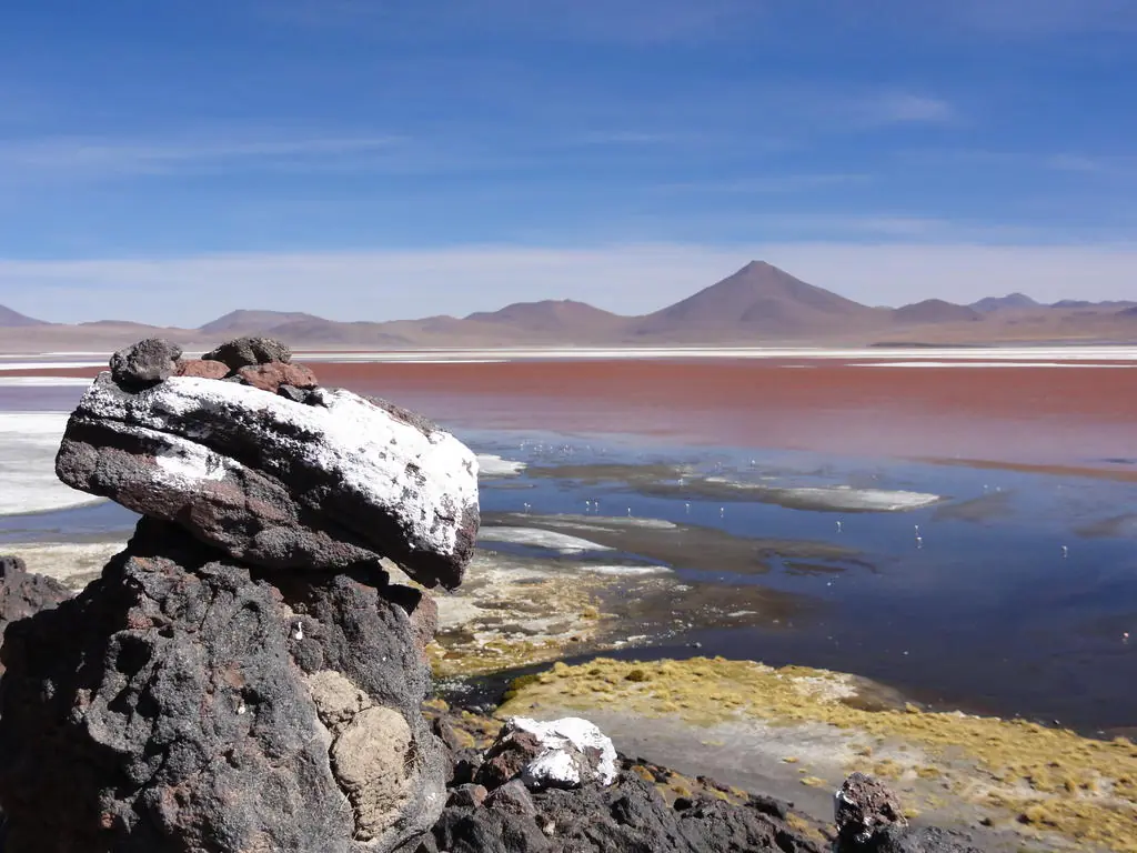 Cinquième jour. Dernier avant la pause prévue. La piste devient meilleure. Nous entrons dans le parc national Eduardo Avaroa, les 4x4 sont tenus de respecter le tracé de la route pour ne pas labourer toute la montagne. C’est bien plus agréable. Nous passons devant l’Arbre de pierre, curieuse formation rocheuse au milieu de tout ce sable. Et arrivons enfin, au terme d’une longue descente, à la Laguna Colorada. Ce lac contient des micro-organismes qui lui donnent sa couleur rouge si particulière à partir du milieu de journée. Nous avions prévu de faire ici une journée de repos car il y a un tout petit regroupement de maisons, dédiées au tourisme, et qui vont nous permettre d’avoir un lit, une douche chaude et à manger ! Cela fait du bien !