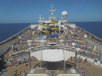 Tout à bord est fait pour consommer au maximum, et ça marche. Entre les cocktails, les objets de camelote vendus à très bons prix, les excursions d’escale hors de prix, certains doivent lâcher de véritables fortunes au cours de ces croisières. La moyenne d’âge est plutôt, disons… élevée, avec, sur 3 000 passagers, soixante personnes de moins de cinquante ans. Ambiance débridée garantie ! Même les quelques jeunes étaient déjà vieux dans leur tête, un bonheur ! Sans compter les sempiternelles réclamations et autres coups de gueule d’éternels râleurs qui ont tout pour passer un bon moment, et arrivent encore à se prendre la tête pour des détails futiles. Nous avons même vu des gens se taper dessus à plusieurs reprises, littéralement parlant je veux dire. Hallucinant ! Les gars du bureau des réclamations ne doivent pas être gâtés. Heureusement, nous avons réussi à rencontrer quelques personnes sympa, mais dans l’ensemble, nous n’avons pas vraiment accroché… Trop de décalage peut-être avec notre environnement de ces derniers mois. Nous nous y attendions un peu, il faut dire.