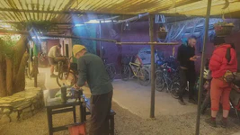 Après la traversée du désert de sel, l’entrée dans Uyuni n’a rien, vraiment rien d’une arrivée dans une oasis. Rues poussiéreuses, vent quotidien, pas de centre-ville un peu joli, point de départ d’excursions pour gringos donc prix pour gringos, bref, cette ville ne présente que peu d’intérêt… Heureusement, nous nous réfugions dans la casa de ciclista Puinguï de Myriam ! Et c’est bien ! Nous nous y installons pour quelques jours, enfin cinq jours pour être plus précis. Ici, rien de luxueux : une douche et un toilette pour tout le monde ; si affluence il y a, on partage bien sûr sa chambre avec des inconnus ; pas de lit mais des palettes sur lesquelles poser les matelas de bivouac. Mais l’ambiance y est chaleureuse ! Les chambres sont distribuées autour d’un patio central couvert, avec tables, bancs, hamacs, cuisine, chiens, chats et perroquet. Nous y partageons plusieurs repas avec tous les cyclistes qui arrivent chaque jour : argentins, polonais, tchèques, états-uniens, italiens (merci Claudio pour les bonbons et les gâteaux pour les enfants !), allemands, britanniques, etc. Il a fallu faire chauffer les cerveaux pour passer, parfois d’une phrase à l’autre de l’espagnol à l’anglais, puis au français pour revenir à l’espagnol.