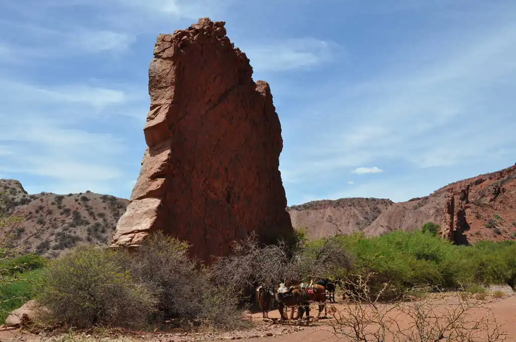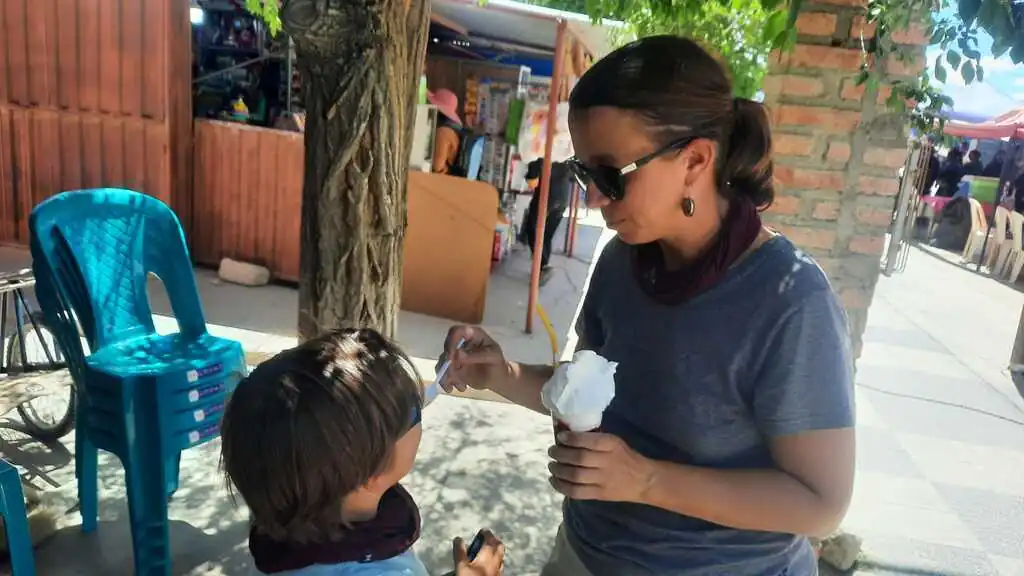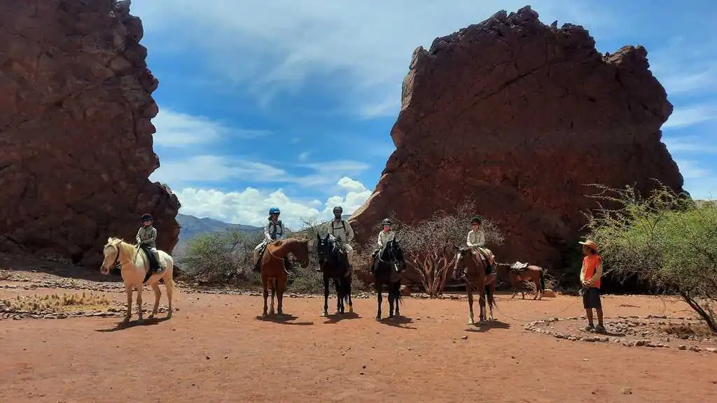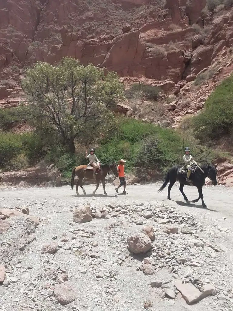 Après six heures de voyage, nous arrivons dans la ville de Tupiza. Nous nous installons dans une auberge de jeunesse pour deux nuits car nous avons promis aux enfants une activité touristique qu’ils attendent avec impatience : une balade à cheval dans le canyon de l’Inca ! Nous avons perdu un peu en altitude et cela se sent : il fait bien plus doux et dans la ville, il y a une place centrale avec des arbres et même de l’herbe !! Même si le paysage autour reste très aride, ça fait du bien ce vert et ces fleurs !! Le lendemain, comme promis, nous passons la matinée à cheval, histoire de faire travailler d’autres muscles des jambes. Les enfants sont ravis, Alicia bien sûr, Sofia est très fière de monter son propre cheval, et Nahuel, après une petite blague de son cheval qui a la bonne idée de commencer la balade par une ruade, reprend rapidement confiance. Nous nous baladons entre des formations géologiques assez fascinantes, c’est magnifique !