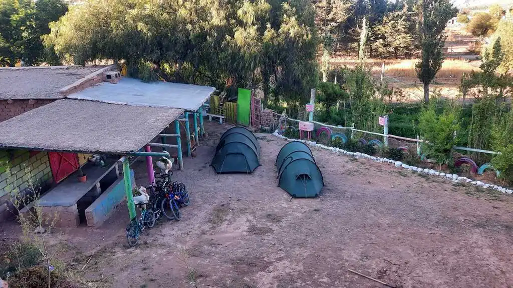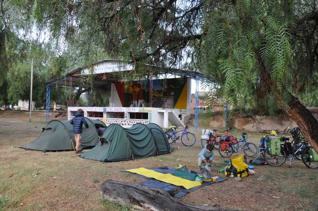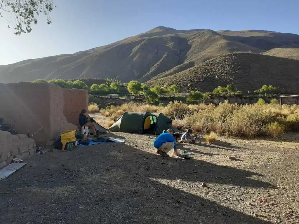 Premier soir après Très Cruces, après avoir essuyé un refus poli dans une école (“Le Directeur n’est pas là, je ne peux pas prendre la responsabilité de vous héberger.”), nous trouvons un joli petit coin de bivouac avec vue imprenable sur la petite vallée. Eau douce pas très loin, peu de vent, atmosphère très paisible, nuit étoilée, quel plaisir ! Bon, en termes gastronomiques, ce n’est toujours pas fou : on mange encore des pâtes vraiment mal cuites (la faute à l’altitude, mais aussi à la qualité du produit, pas au cuistot !). Au matin, comme depuis quelques jours, on essaye de partir entre 8h30 et 9h00. Le vent se levant au fur et à mesure de la journée, on essaye d’avancer au maximum le matin. Et on s’arrête pas trop tard le soir pour avoir le temps de profiter et de faire les leçons avec les enfants. La “descente” continue, on perd de l’altitude progressivement. Nous faisons étape à Huacalera pour la deuxième nuit dans cette vallée, dans un tout petit camping où nous sommes seuls, c’est royal.