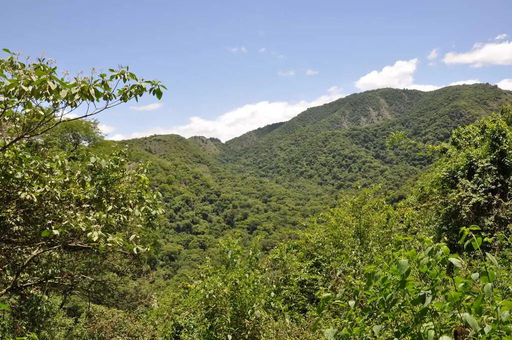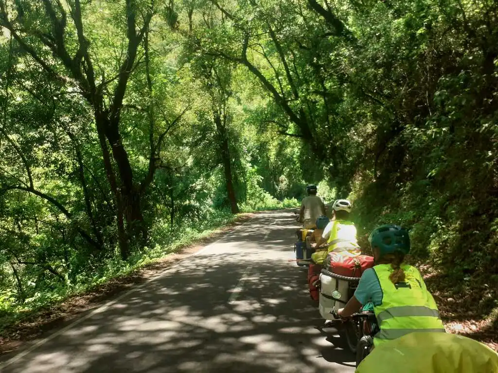 Au quatrième jour de cette interminable descente, ascenseur émotionnel ! Un peu blasés par le vent, et comme Nahuel était patraque la veille, on retarde le réveil. On partira quand on partira, tant pis pour le vent ! Le vent souffle ENFIN dans notre dos !! On est super content, on se dit qu’on va enfin en profiter de cette descente ! Nous parcourons 13 km en très peu de temps, à une moyenne de 30 km/h sans rien faire. Quel pied ! Et tout à coup, sans aucun signe avant coureur, il y a en 15 secondes une bascule de vent et on se retrouve de nouveau à lutter contre un gros vent de face ! C’est dur !! Cette descente c’est l’arnaque du siècle ! Enfin, après une ultime belle montée face au vent, nous descendons fort d’un coup sur plusieurs centaines de mètres de dénivelé (et nous trouvons encore le moyen… d’être bloqué par un camion !). Et là, mais là !!! Quel bonheur ! En quelques kilomètres, les montagnes se couvrent d’arbres, tout devient vert, l’air plus humide et plus chaud : nous entrons dans la partie argentine de la forêt tropicale des Yungas ! Nous retrouvons des odeurs (notamment celle de la végétation humide) et des sons (des insectes !!!) oubliés depuis notre départ. Nous quittons la route principale pour une piste latérale, tout le monde se délecte de ce changement d’ambiance si soudain, les enfants n’en reviennent pas !