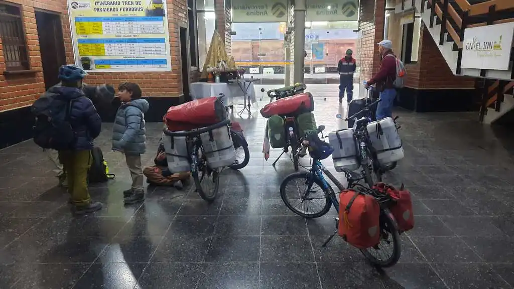 Nous profitons principalement du séjour à Uyuni pour avancer sur le travail scolaire, dormir, faire un peu d’entretien et de réparation de vélo (Sofia ayant cassé des rayons sur sa roue arrière) et manger ! Des papas rellenas (pommes de terre farcies), empanadas saltenas, salades de légumes et même… du brocoli pour le plus grand plaisir des enfants ! Puis, alors que nous regardions pour la suite du programme à vélo vers la frontière, nous prenons connaissance de l’existence du ferrobus ! Pour ceux qui comme nous ne connaîtraient pas, imaginez un bus, un simple bus, bricolé pour pouvoir circuler sur des rails de train. Capacité : 30 personnes. Nombres de passages par semaine : 1. C’est un concept. Cette ligne de ferrobus circule entre les villes de Oruro au nord et Villazon à la frontière. Deux petits soucis cependant : alors qu’une employée de la gare nous avait informé que le train ne circulerait pas le mardi de cette semaine pour cause de jour férié, nous nous rendons compte qu’il est possible d’acheter sur internet des billets pour cette même date. Nous n’arrivons également pas à savoir s’il est possible de monter à bord avec notre barda et nos vélos. Mais comme on est joueurs, on achète les billets et attendons deux jours de plus. Et, le dit mardi matin, nous sommes à la gare à 5h30 sans savoir si nous pourrons monter dans ce fameux ferrobus, ni même s’il va passer. Au pire, on est prêt à pédaler exceptionnellement tôt !