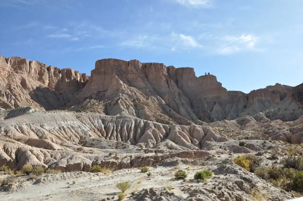 Là, si vous avez bien suivi jusqu’ici, vous devez vous demander : « Mais c’est quoi l’Arnaque du Siècle ??? ». Parce que bon, jusqu’ici, tout va bien. Eh bien, l’arnaque du siècle, c’est justement cette descente. Depuis le col, jusqu’en bas, soit près de 190 km, nous aurons eu 13 km à peu près de véritable descente, à savoir sans avoir besoin de forcer sur les pédales pour avancer. Donc soit sans vent, soit avec le vent dans le dos. Tout le reste du temps, nous aurons eu un FORT vent de face qui nous a obligé à pédaler bien souvent malgré le dénivelé négatif. C’était frustrant mais ça nous a quand même bien fait rigoler. Et surtout le paysage est resté superbe ! La géologie de la région doit être vraiment intéressante car ces montagnes sont fascinantes par leurs formes et leurs couleurs.