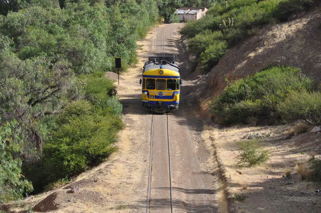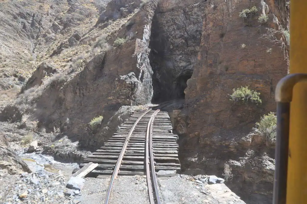 Et finalement, contre toute attente, tout se passe très bien. Le ferrobus arrive (à l’heure !), nous chargeons tous nos bagages à l’intérieur sans aucun problème, les employés du ferrobus (le chauffeur, le mécanicien et son aide) nous aident très gentiment à charger les vélos sur le toit sans demander de supplément, nous montons dans ce tout petit mode de transport presque uniquement occupé par des boliviens, et nous partons (à l’heure !). Nous quittons la ville d’Uyuni en direction de Tupiza pour un trajet exceptionnel ! Les cinquante premiers kilomètres, la ligne de chemin de fer traverse une vaste plaine. Nous avons la chance de voir de nombreux troupeaux de lamas, de vigognes, mais surtout des nandous (sorte d’autruche), des viscachas (espèce de rongeurs) et même quelques flamants roses au loin. Puis, rapidement, le ferrobus se dirige vers des montagnes et nous nous y engouffrons. Là commence un trajet digne d’un petit train du far-west. Les rails serpentent au sein de paysages incroyables : canyons, montagnes colorées, ravins, etc. Parfois, il faut avoir le cœur bien accroché, quand on passe sur un petit pont de bois qui semble ne pas tenir sur grand-chose, ou qu’on aperçoit, là tout en bas, les vestiges de l’ancienne voie ferrée tombés dans la rivière à cause de la forte érosion ! Sujets au vertige s’abstenir…