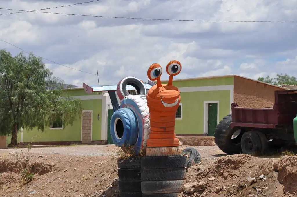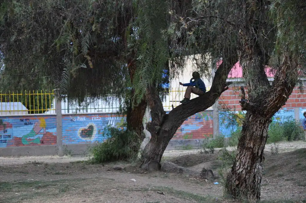 Nous quittons Tupiza en ayant conscience que nous partons pour un beau morceau de trajet sur les jours à venir. Quelques kilomètres de plat descendant après être sortis de cette ville, nous attaquons une belle montée, pas très longue mais avec une pente assez forte. Le temps est à l’orage. Nous nous abritons le temps du déjeuner dans la toute petite école (vingt élèves de trois à douze ans) de Saladillo afin de laisser passer la pluie et les éclairs. Puis, en fin de journée, nous trouvons un coin un peu à l’abri pour la nuit. Ce soir, ce sera sur le bord du terrain de foot du petit village de Yuruma. Malgré la pluie et le petit orage de nuit, nous sommes bien au calme. C’est même grand luxe car nous montons les tentes sur de l’herbe ! Ça change des cailloux et de la poussière. Les enfants observent avec plaisir un chat blessé à la patte venir s’installer dans l’abside de leur tente pendant l’orage. Nahuel lit dans les arbres, les filles jouent au mouton / cheval / lama et sa bergère, comme tous les jours en ce moment. Tout est calme.