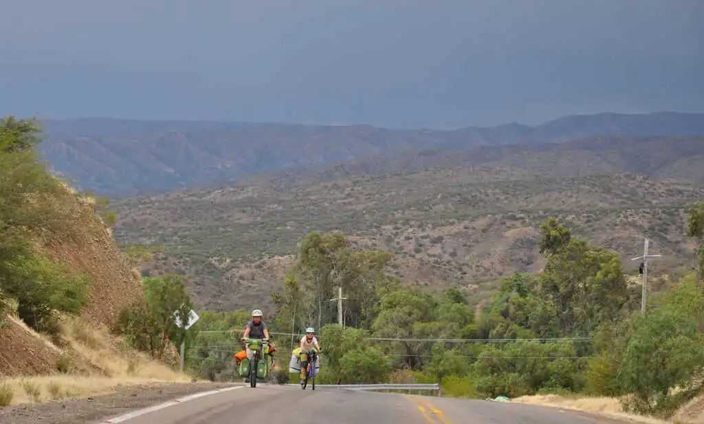 Au départ de La Quiaca, le lendemain, nous sommes de nouveau sur l’altiplano, en enchaîne les grandes lignes droites dans la pampa, le vent souffle fort et… contre nous. C’est beau mais c’est dur, il faut s’armer de patience. Heureusement, quelque chose nous motive, dont nous avons parlé aux enfants : dans quelques dizaines de kilomètres nous attend la descente de l’altiplano, 190 kilomètres pour passer de 3500 à 1300 mètres d’altitude (San Salvador de Jujuy). Nous espérons n’avoir qu’à nous laisser plus ou moins glisser jusqu’en bas. Pour cette première étape en Argentine, nous battons notre record de distance en une journée : 75 km, malgré le vent qui ne cessera de monter dans l’après-midi. Nous essuierons même une tempête de sable, gommage gratuit offert ! Les dents croustillent mais la peau est douce. Le lendemain, après une belle dernière montée, nous quittons définitivement l’altiplano et arrivons au dernier col avant la descente : Très Cruces. On jubile, on a hâte de profiter de ces kilomètres faciles !