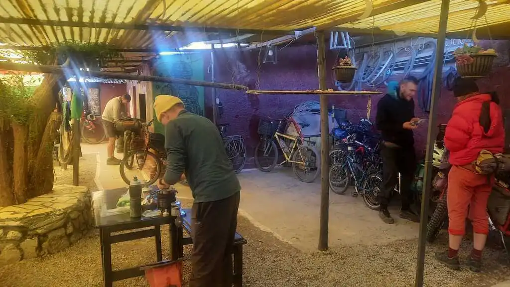 Après la traversée du désert de sel, l’entrée dans Uyuni n’a rien, vraiment rien d’une arrivée dans une oasis. Rues poussiéreuses, vent quotidien, pas de centre-ville un peu joli, point de départ d’excursions pour gringos donc prix pour gringos, bref, cette ville ne présente que peu d’intérêt… Heureusement, nous nous réfugions dans la casa de ciclista Puinguï de Myriam ! Et c’est bien ! Nous nous y installons pour quelques jours, enfin cinq jours pour être plus précis. Ici, rien de luxueux : une douche et un toilette pour tout le monde ; si affluence il y a, on partage bien sûr sa chambre avec des inconnus ; pas de lit mais des palettes sur lesquelles poser les matelas de bivouac. Mais l’ambiance y est chaleureuse ! Les chambres sont distribuées autour d’un patio central couvert, avec tables, bancs, hamacs, cuisine, chiens, chats et perroquet. Nous y partageons plusieurs repas avec tous les cyclistes qui arrivent chaque jour : argentins, polonais, tchèques, états-uniens, italiens (merci Claudio pour les bonbons et les gâteaux pour les enfants !), allemands, britanniques, etc. Il a fallu faire chauffer les cerveaux pour passer, parfois d’une phrase à l’autre de l’espagnol à l’anglais, puis au français pour revenir à l’espagnol.