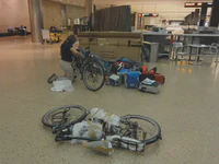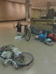 A l’arrivée, il a fallu récupérer les bagages et s’y retrouver dans les dédales de l’aéroport de Seattle. A notre grand soulagement, tout est bien arrivé en bon état, y compris les vélos. Nous avons mis quatre heures pour sortir de l’avion, passer les contrôles, remonter les vélos, arranger les sacoches… Faire tout ça après vingt-quatre heures sans sommeil, le ventre assez vide et la pression du départ qui retombe et celle de l’arrivée qui monte (oups, il fait déjà nuit. Mais où va-t-on dormir ce soir ?), ça a été assez difficile. Heureusement, nos premiers contacts avec les Américains ont été très sympas : dès l’aéroport, nous avons reçu l’aide et les encouragements de quelques curieux venus voir ce que nous préparions.
