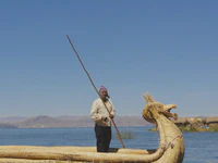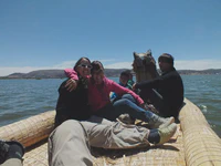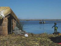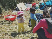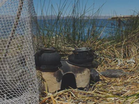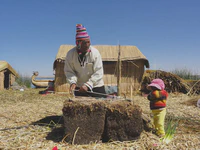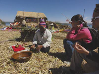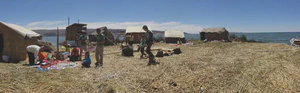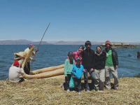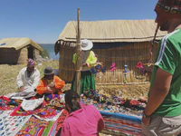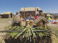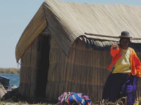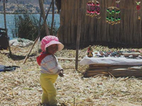 Par le biais d’un de ces pêcheurs, nous avons pu aller visiter l’île Uros Titino, une de ces fameuses îles flottantes en roseaux si connues. En face de Puño, de nombreuses îles de ce type sont placées, mais nous étions un peu dubitatifs quant à leur visite car ce ne sont malheureusement que des îles à touristes, dont les habitants vivent en fait sur la terre ferme et n’arrivent sur les îles qu’avec les bateaux charriant les visiteurs. Mais ce pêcheur nous a emmené sur une autre toute petite île, bien plus isolée. C’était pour nous la meilleure façon de connaître ce type d’habitat, encore une visite magique !!! Cette toute petite communauté de six familles vit sur cette île. Pourtant, les conditions de vie sont rudes : une heure de bateau pour aller à l’école, isolement, froid, achat sur le principe du troc… Ils affichent clairement leur volonté de développer le tourisme, mais d’une façon bien plus sympa. Ici, pas besoin de débourser des sous à chaque pas, le président de l’île présente leur façon de vivre, les objets typiques de leur vie de tous les jours, la technique de construction de leurs îles… Tout ça dans une ambiance très cordiale. En échange, ils vendent leur artisanat qu’ils fabriquent en direct. Nous avions un peu peur d’un effet zoo mais c’était en fait un véritable échange. Bref, un vrai moment de bonheur, nous avons tout simplement eu l’impression de faire une sacrée rencontre avec des gens éduqués, fiers de leurs cultures et fiers de la partager !