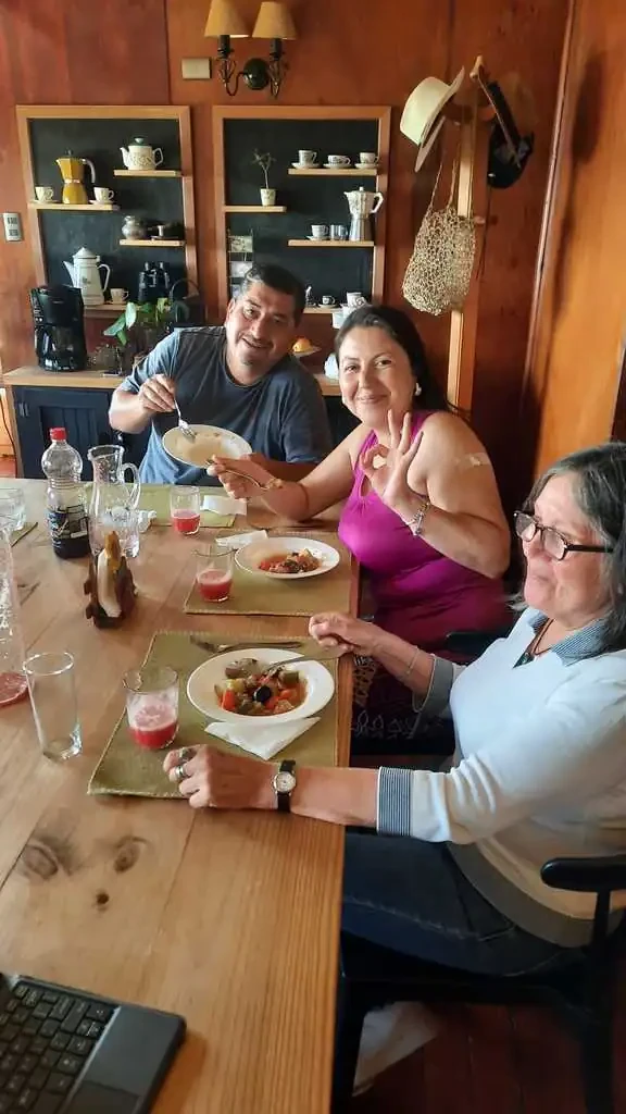 La cuisine étant très bien équipée, nous sommes ravis : on va pouvoir se régaler et faire découvrir de bons petits plats de chez nous à notre famille d’adoption. Au cours de la semaine, nous cuisinons : crêpes, ratatouille (recette de mamie Sanso), quiche lorraine, gratin de courgettes, gratin dauphinois, crumble, gâteau nantais, cookies, marcellin (recette de grand-mère Bretagne) et même ! même ! un fondant au chocolat. Et dans les verres, des ti’punchs ! Un vrai tour de France culinaire ! Ça fait vraiment vraiment plaisir de cuisiner et régaler nos hôtes et apparemment, la ratatouille, c’était le comble du chic (référence à un certain dessin animé…) ! Henry et Pamela se chargent aussi de nous partager leurs recettes : merlu pané, ceviche de cochayuyo (Durvillae antarctica, espèce d’algues brunes pouvant atteindre 15 mètres de long, préparée avec du citron, des tomates et des condiments), completo… sans oublier les boissons locales : fanchop (fanta-bière), pisco, melon-vin, et tout un tas d’aguardientes (eaux de vie) dont les trop nombreux noms ne se sont pas imprimés dans nos mémoires… rapport à l’heure tardive, tout ça tout ça… Notons aussi que cette rencontre culturelle a aboutie à un métissage mettant en avant le meilleur de ces deux cultures, matérialisé par un nouveau rafraîchissement nommé le Chi-chi-pon : base de ti’punch, puis insérer dedans une bouteille de bière renversée, servir avec une paille en métal (bombilla). Le résultat est… renversant évidement ! Autant vous dire qu’entre le manque d’activité physique et les excès, nous avons refait un peu de gras !