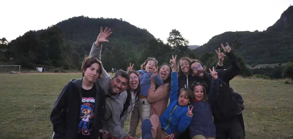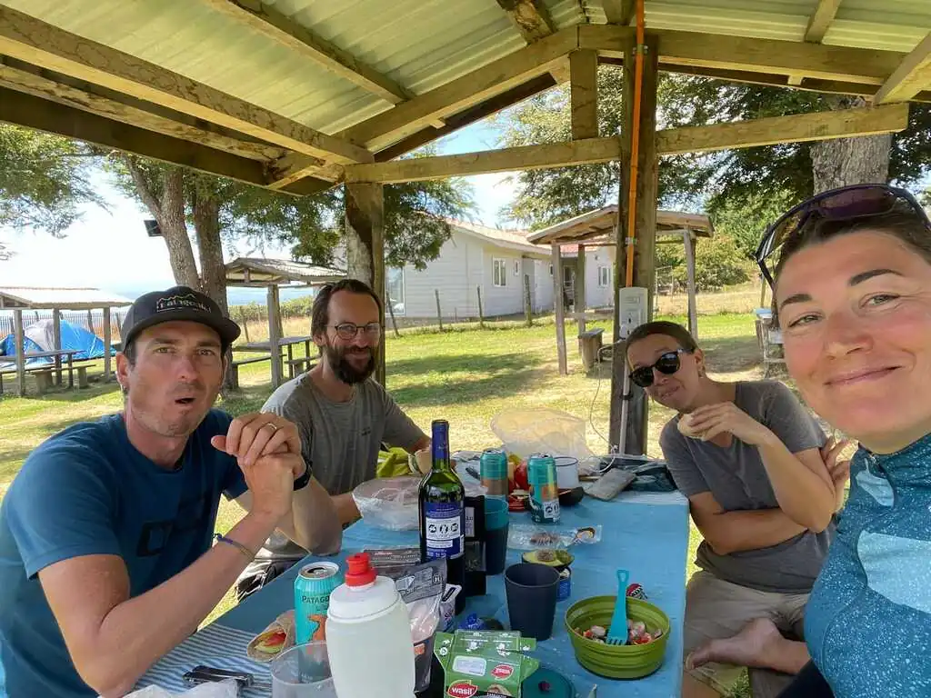 Et finalement, nous remercions presque Sofia pour cette pause inattendue car elle nous permet de passer une super semaine en compagnie d’une chouette famille chilienne : Pamela et Henry, les parents, Amara et Matteo, leurs enfants, et enfin Orfa, la maman de Pamela en vacances à Futrono. Ça commence fort le premier soir où nous arrivons chez eux vannés à 21h00, encore un peu sous le choc de la mésaventure matinale de Sofia. On décharge les vélos, on installe nos affaires, couchons les enfants… et nous rendons compte qu’un barbecue de bienvenue est en préparation ! Ok, si on veut en profiter, il va falloir se mettre au rythme chilien : goûter vers 19h00, dîner à 22h00, on trinque à 1h00, se couche à 2h00 et… grasse matinée jusqu’à 10h00 !