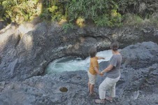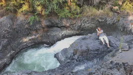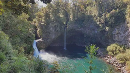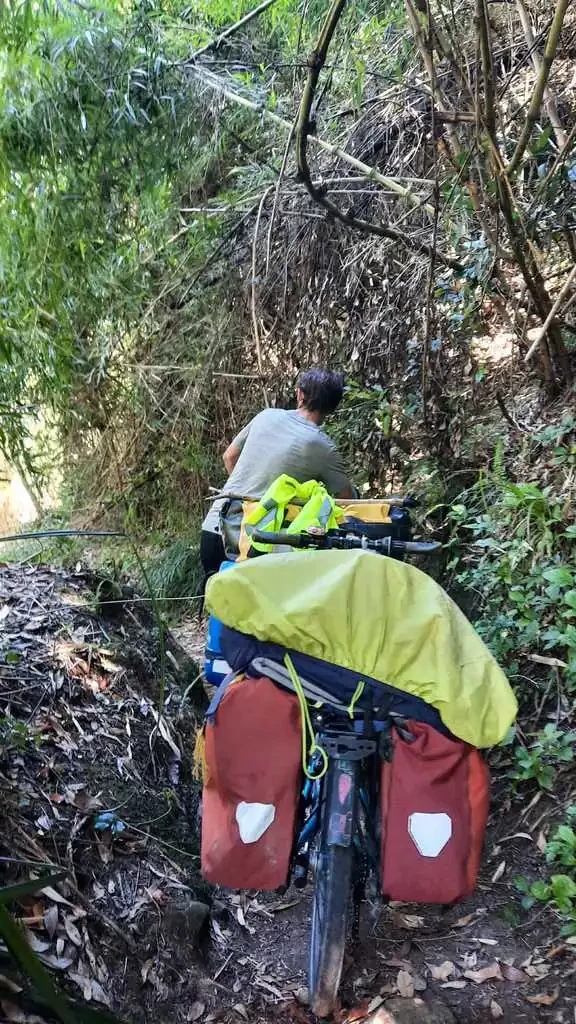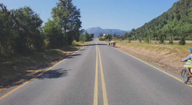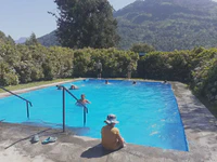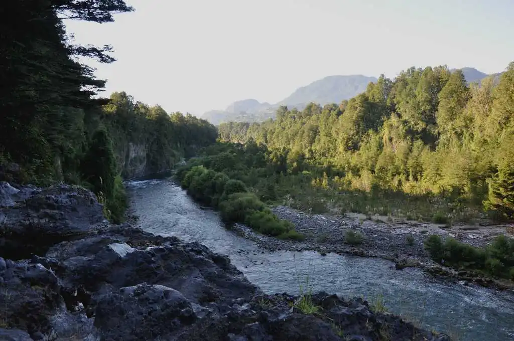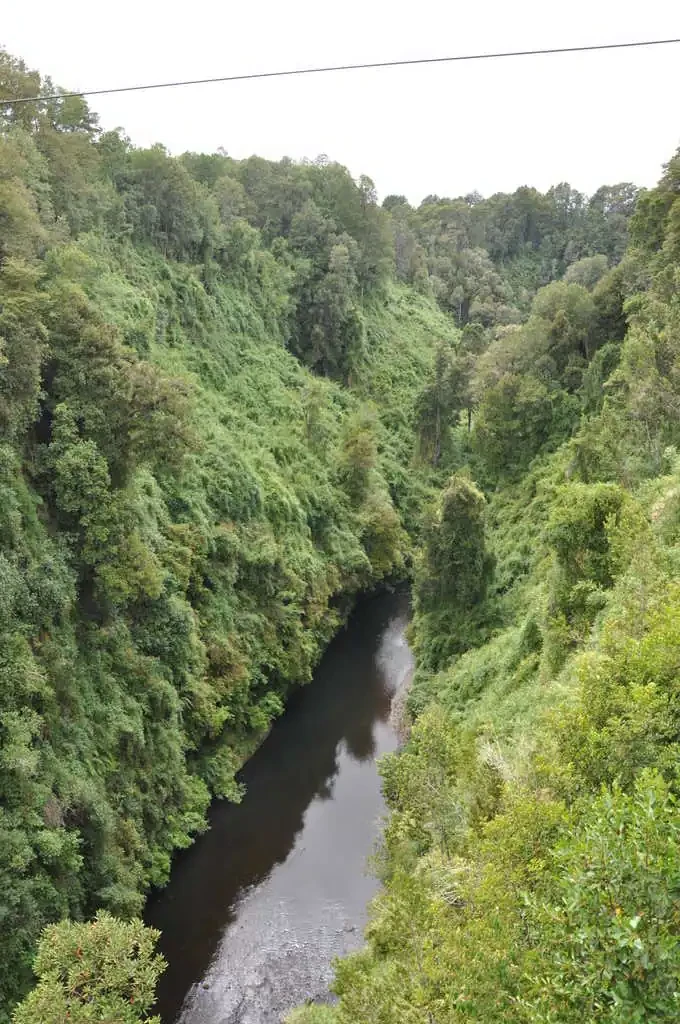 Malgré le petit pincement au cœur au moment du départ, nous avons hâte de repartir ! C’est toujours comme ça pendant les pauses : un sentiment partagé entre le bonheur de quelques jours immobiles et l’envie irrésistible de remonter sur nos vélos. C’est un plaisir d’observer cela aussi chez les enfants : les premiers kilomètres, la flemme domine, mais au bout de quelques kilomètres, il y en a toujours un des trois pour dire quelques choses comme : « Aaaaaah, ça fait tellement du bien d’être de nouveau en route ! ». Nous (re)quittons donc Futrono le dimanche 18 janvier à midi passé (record battu de départ tardif, ça commence bien !), il fait grand beau, c’est 100 % plaisir ! Quitte à être lents, nous avons décidé de ne pas faire les choses à moitié et de faire le “presque” tour du lac avant de reprendre vers le sud. Cela nous permet de passer par le côté moins balnéaire et moins plat. Au bout de 15 kilomètres, aïe ! On tombe… sur un spot de baignade parfait ! Une rivière aux eaux translucides et vert profond se glisse dans une étroite gorge formée de deux murs verticaux de roches noires. Elle se déverse ensuite dans plusieurs bassins, dont un suffisamment profond pour pouvoir y sauter depuis de belles hauteurs. Ce serait criminel de ne pas faire un stop pour s’y baigner ! On descend les vélos au plus proche de la plage de galets, via un petit chemin par vraiment prévu pour (qu’il faudra ensuite remonter…), cette pause pique-nique est parfaite, sauf pour la pauvre Sofia qui ne peut pas encore se baigner pour cause de « cicatrisation en cours » !