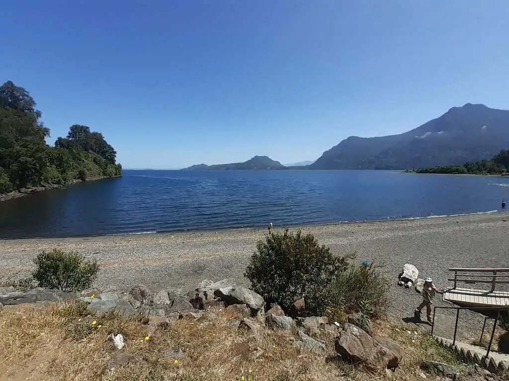 Sur la rive sud du lac, la route est un peu moins sympa, il y a pas mal de trafic. L’accès à la berge n’est pas toujours évident car au Chili, en général, la nature est très privatisée. A la recherche d’ombre pour le déjeuner, nous demandons à un couple si nous pouvons pique-niquer sous le grand arbre à l’entrée de leur propriété, ils nous permettront finalement de traverser cette dernière pour aller piquer une tête dans le lac. Arrivés au bout du lac, nous passons devant un centre de santé : nous nous arrêtons pour faire vérifier l’oreille de Sofia. Le médecin confirme que Sofia transporte bien un petit passager clandestin. Alors des infirmières essayent de l’enlever par tous les moyens : eau, glycérine, mini-aspirateur, pince à épiler, mini-cuillère… Après deux heures d’essais infructueux, il est mort, mais ne veut toujours pas sortir ! Il va falloir revenir demain. Sauf qu’il est 19h20, et que nous n’avons toujours pas de plan pour dormir ce soir… Heureusement, Olivier croise Alejandro et son fils Pedro devant l’hôpital. Après quelques minutes à échanger, ils nous invitent à passer la nuit chez eux. Leur maison n’est pas très grande, il n’y a qu’une pièce dans laquelle nous dormirons tous, mais quelle gentillesse de nous accueillir comme ça ! Nous espérons que les enfants retiendront ce genre d’exemple pour le reste de leur vie. Un grand respect pour Alejandro qui est capable de préparer une pizza maison à partir de zéro, tout en discutant et en subissant les assauts d’un lumbago, en à peine 10 minutes. Le lendemain matin, nous sommes de nouveau au poste de santé à 9h00. La médecin, à court d’idée, fait venir une otorhinolaryngologiste (mot compte triple !) qui fait 40 minutes de voiture juste pour Sofia. Après encore une heure d’essai, un bain d’eau oxygénée, et une observation de l’intérieur de l’oreille de Sofia via une micro-camera, l’otorhino arrive enfin à extraire la bête en injectant un bon demi-litre d’eau dans l’oreille de Sofia. L’espèce n’a pas pu être identifiée, mais c’était un beau morceau ! Ouf !