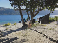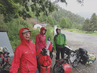 Mais le jour du départ, gros pas de bol : il fait un temps super pourri, peut-être une des pires journées du voyage au niveau pluie et vent. Nous n’avons pas le choix, les billets sont pris ! Nous prenons à successivement deux bateaux, puis une bonne montée bien pentue sous une pluie qui pourrait s’apparenter à une grosse douche froide nous attend. Hummmmm ! Nous sommes tout mouillés ! Sur la route, des policiers sympas nous prennent nos sacoches pour les emmener en voiture jusqu’au prochain bateau, pour qu’on puisse aller plus vite et être sûr de ne pas le louper. Et ça marche ! On saute dans le dernier bateau in extremis. Le voyage est épique jusqu’au bout : le débarquement final se fait sous un déluge de pluie et de vent, genre bonne tempête bretonne. Un régal ! Bon, nous n’aurons pas profité du paysage à 100 %, mais le voyage était quand même chouette et on s’est bien marré au final !
