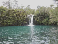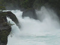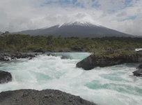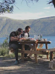 Passé cela, le reste du trajet est une pure formalité, avec en plus une bonne surprise. Car l’avantage de voyager sans guide touristique, c’est que du coup, il y a toujours plain de surprises ! Ce jour-là, par exemple, nous tombons sur les chutes de Petrohué, pour lesquelles les gens viennent apparemment de loin. C’est effectivement un bel endroit, des chutes magnifiques au pied du volcan Osorno. Et du coup, à cause de cette pluie qui nous a tellement embêté, le site est encore plus beau car le torrent est haut et encore plus sauvage ! Le soir, petit bivouac sur un terrain privé, avec bonne herbe grasse et moelleuse, et vue sur le lac s’il vous plaît, avec un très gros pot d’un kilo de manjar (merci pour le tuyau les Dou !) et des petits pains maisons offerts par la voisine. Le super pied !