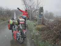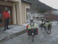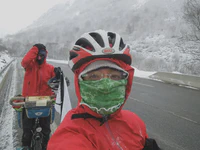 Le lendemain de cette sympathique soirée, nous avons prévu de passer notre tout dernier col, à la force de nos mollets. Après ce dernier sursaut géographique, pura bajada jusqu’à la maison. Mais la météo en a décidé bien autrement : températures polaires, chute de neige, visibilité limité, verglas sur la route, et col perdu au milieu des nuages. Les prévisions se confirment, apparemment les voitures ne passent que difficilement. Tant pis, il faudra qu’on revienne un autre jour, pour nous ne voulons pas prendre le risque d’une belle gamelle à la descente. Nous avons oublié les pneus neige… Seule alternative : le tunnel qui coupe dans la montagne. Heureusement, le tunnel voiture (interdit à la circulation des vélos) est doublé d’un passage avec une voie ferrée. Nous sautons donc dans un train le temps de passer ce qui aurait dû être notre dernier col. De l’autre côté, c’est encore ambiance Pôle Nord. Nous nous équipons mieux que jamais, comme nous l’avons rarement fait. Pas un petit bout de peau ne peut dépasser, nous adoptons la méthode oignon en empilant les couches de vêtements. L’humidité rend le froid un peu moins agréable. Une fois bien emmitouflés, en route pour une soixantaine de kilomètres en descente vers Foix. Les débuts sont plutôt frais : nous ne pédalons pas et nous refroidissons donc à grande vitesse. Et dire que nous avons rarement eu aussi froid du voyage… Adieu rêves de retour sous le grand soleil printanier !