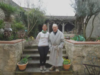 Premier soir en France. Il fait TRÈS froid. Non pas que nous n’ayons pas connu de températures inférieures pendant le voyage, mais l’humidité nous mord et perce nos vêtements. Nous arrivons au village de Porta. Nous décidons de nous arrêter là pour la nuit, car la luminosité baisse et le ciel n’engage pas à poursuivre. Le village, tout petit, semble déserté de ses habitants. Chacun de notre côté, nous essayons de trouver une âme qui vive ici. Nous tombons enfin la mairie qui semble occupée, c’est le moment de tester l’hospitalité à la française. La première accroche est difficile. Marie, qui a son petit laïus tout prêt en espagnol, est perdue avec les mots de sa langue maternelle. Premier contact, premier vent : « Ah non, ça ne se fait pas chez nous ! » Ah. Persévérons quand même, pour voir. « Ah, mais vous venez de loin ? Ah oui, le continent américain, quand même !, Mais les gens vous ont souvent accueilli chez vous ? » Et voilà, de fil en aiguille, nous gagnons la confiance de Madame le Maire, trouvons un plancher accueillant et un local chauffé pour dormir, assistons à une mini conférence pour la commune, on nous offre le thé, et nous dînons, pour finir, au restaurant avec la Maire avec qui nous passons une très bonne soirée.