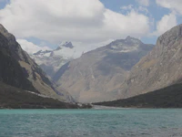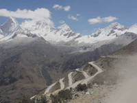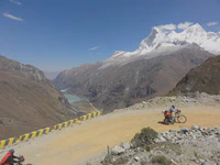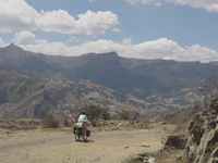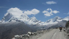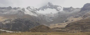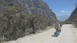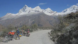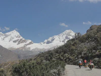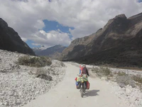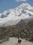 Être en compagnie de Rémi et Jennifer nous a sûrement aidé à tous nous sentir un peu plus fort face à l’ampleur du défi. Et le mardi 4 septembre, nous remontons sur nos petits vélos, fonçant droit vers ce monstre, cette chaîne majestueuse, ce bijou de roche, de neige et de glace. Le premier jour commence plutôt sous de bons auspices : une bonne route d’asphalte bien lisse, en pente très douce, un grand ciel bleu, le guidon de Marie au meilleur de sa forme malgré son accrochage récent, et une excitation pas du tout cachée d’aller se frotter à la haute montagne. Une première petite pause dans la ville de Yungay histoire de faire les dernières petites courses : boîtes de thon, pain, petits gâteaux et quelques tomates. Et nous voici embarqués sur une piste piquant droit vers les premiers sommets enneigés, défoncée, parfaitement comme on les déteste, pleine de caillasses pointues, de sable et de trous. En plus de cela, un vent frais se lève et de vilains nuages s’amassent dans les hauteurs.