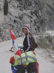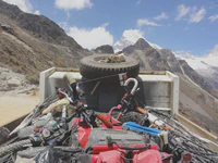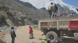 Malheureusement, Marie n’arrive pas suffisamment à s’adapter à ces hautes altitudes, et après une heure un peu difficile avec de méchantes douleurs dans la poitrine, le sorocho (mal des montagnes) l’empêche d’aller beaucoup plus loin. Encore une fois, l’équipe est là, et un relais s’organise pour lui permettre de monter à pied sans avoir à se traîner son vélo. L’objectif est d’arriver tous ensemble au col à 4 740 mètres ! Mais la fatigue est la même pour tout le monde et la tâche est difficile. Malgré la grande frustration que cela implique, nous (Marie et Olivier) décidons de faire du stop camion pour passer le col, alors qu’il ne reste seulement que 300 mètres de dénivelé à manger tout cru (sur les 2 600 mètres que nous avions à faire !!!). Dur dur, mais c’est comme ça. C’est la dure loi de la montagne !