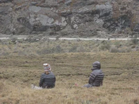 Nous voilà donc embarqués avec nos montures dans la benne d’un camion de chantier, et en deux temps trois mouvements, nous passons le col. Nous continuons encore un peu pour redescendre vers 4 400 mètres et calmer le sorocho de Marie. Nous attendons Rémi et Jenn, qui passent courageusement le col à vélo, allongés dans l’herbe au bord d’un petit lac d’altitude. À leur arrivée, nous plantons là le plus haut bivouac que nous n’ayons jamais fait. À la nuit tombée, la température est glaciale et la fatigue de la journée se fait sentir. Malgré le manque d’oxygène qui rend parfois les nuits agitées, à 19 heures nous sommes couchés, et à 20 heures tout le monde dort…