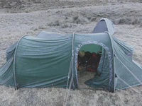 Durant la nuit, les températures chutent : nous passons allègrement au-dessous de zéro. Des stalactites ont poussé au fond de la tente, le seau d’eau de vaisselle a complètement gelé. Heureusement, nous sommes bien au chaud dans nos super duvets. Au matin, nous restons bouche-bée devant le décor qui est autour de nous. Le givre recouvre tout, le ciel est limpide, les montagnes incroyables. Il fait très froid, mais le soleil qui se lève nous réchauffe vite. Nous ne sommes pas pressés, nous profitons du spectacle…