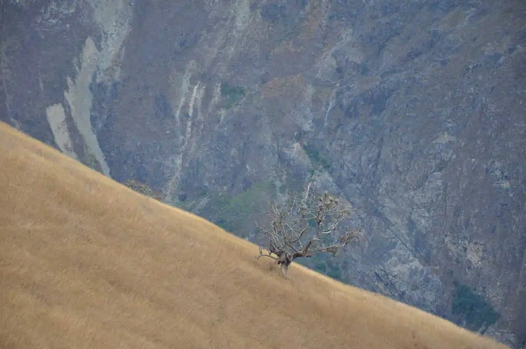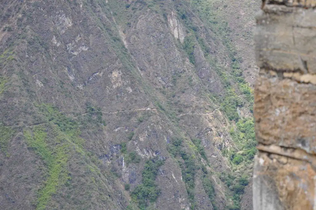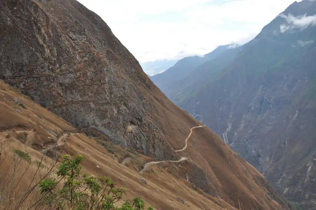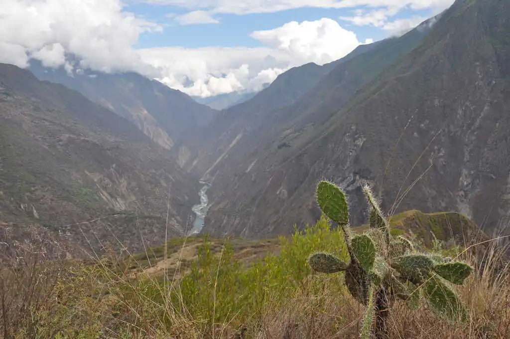 La végétation est magnifique : au cours de la descente, nous traversons d’abord toute une zone à l’herbe sèche puis, en changeant de pan de montagne, nous arrivons dans un paysage digne d’un western : rocaille, poussière, cactus, arbres secs… c’est magnifique ! Le long du parcours jusqu’à Choquequirao s’égrainent 3 petits lieux où il est possible de se ravitailler, manger et/ou dormir. Nous faisons une petite pause casse-croûte à Chiquisca, puis finissons la descente. Nous arrivons au pont qui traverse l’Apurimac, et sommes prêts pour la montée… à 12h30, en plein cagnard ! Eh oui, nous ne sommes « plus qu’à » 1500 m d’altitude et il fait vraiment super chaud ! Le début est plutôt laborieux, Alicia est un peu patraque. Nous hissons les deux filles sur un des chevaux et continuons. Et c’est à ce moment que j’ai (Marie) testé pour vous, l’hypoglycémie en grosse randonnée ! Ça ne m’était jamais arrivé, je n’ai donc rien vu venir et ai mis du temps à comprendre ce qui n’allait pas. Au début, nous pensons à un coup de chaud : j’ai le souffle court, une barre à travers le ventre et vraiment, je n’arrive plus à avancer. Mais alors plus du tout. Je ne sais pas trop comment, j’arrive à grimper les 500 mètres de dénivelé positifs entre le pont et Santa Rosa Baja, mais les 200 mètres suivant jusqu’à Santa Rosa Alta me paraissent durer des heures. Olivier me traîne laborieusement (littéralement), et je m’effondre à Santa Rosa Alta. Honnêtement, dans ma tête c’était plié, on allait faire demi-tour. Heureusement, je m’engloutis un gros demi-litre de soda américain, des gâteaux, plein de sucre quoi, je dors une demi-heure, et ça repart !