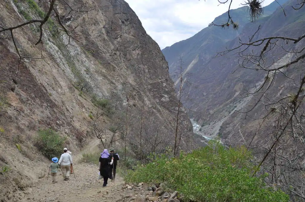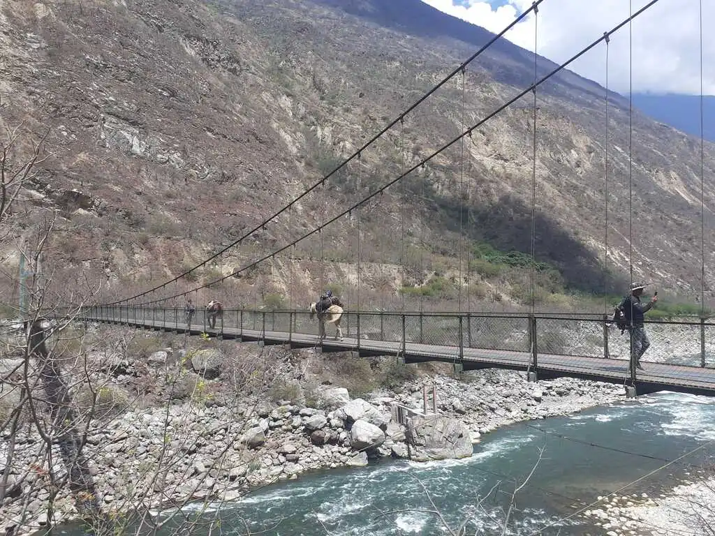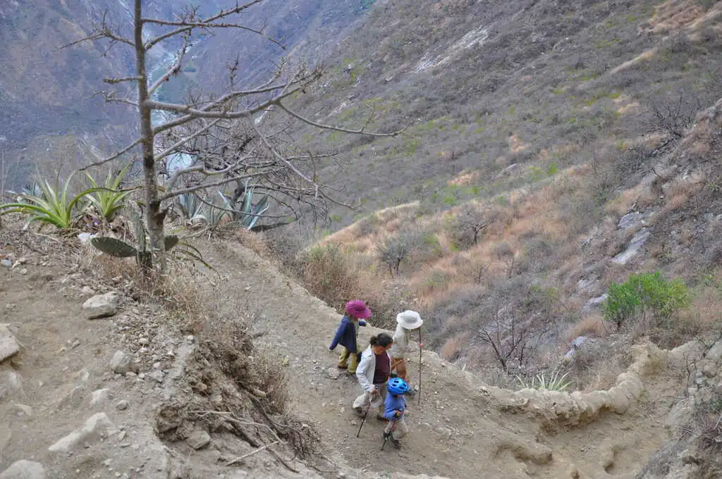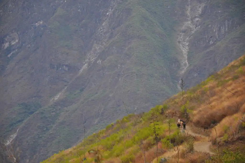 A 7h00, nous sommes au mirador de Capuliyoc, à 3000 m d’altitude. La randonnée commence vraiment et le moins qu’on puisse dire, c’est que c’est mi-époustouflant mi-flippant… Devant nous, en bas, s’étend le canyon de l’Apurimac, 1500 mètres de vide jusqu’au lit de l’imposante rivière, un paysage à couper le souffle. Le chemin plonge sans préambule vers le bas, nous pouvons voir presque l’intégralité du chemin jusqu’à notre objectif. Le programme du jour : descendre jusqu’à la rivière, la traverser puis remonter les 1500 mètres de dénivelé en face pour se hisser en haut de l’autre versant du canyon. Gloups ! Nous sommes accompagnés de Angel, notre guide, et de Doris, son “assistante” en formation pour devenir guide. Avec nous (enfin essentiellement devant nous), Climaco mène ses deux chevaux, l’un porte nos affaires, l’autre est en renfort en cas de coup de mou des enfants. Il est extrêmement impressionnant : il porte de petites sandales et marche vraiment à une bonne vitesse, en montée comme en descente.