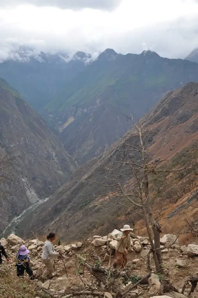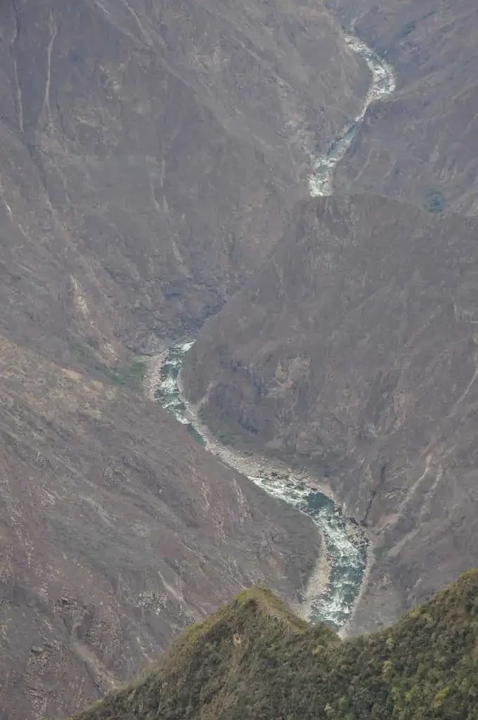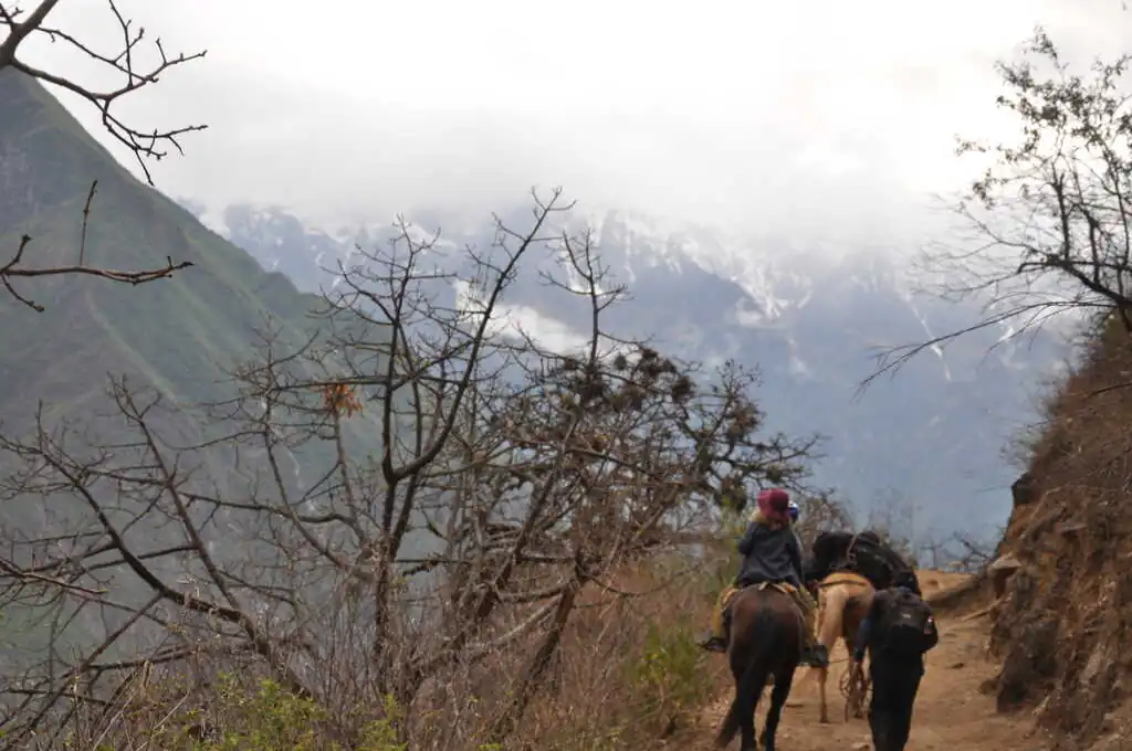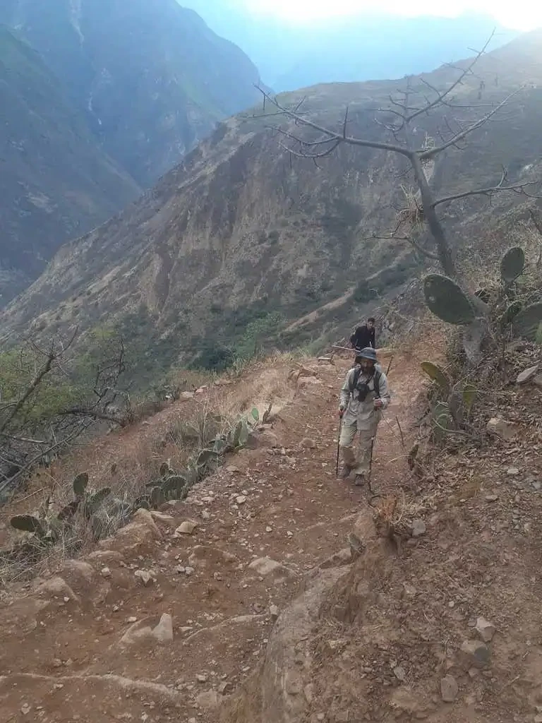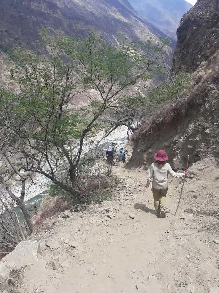A 7h00, nous sommes au mirador de Capuliyoc, à 3000 m d’altitude. La randonnée commence vraiment et le moins qu’on puisse dire, c’est que c’est mi-époustouflant mi-flippant… Devant nous, en bas, s’étend le canyon de l’Apurimac, 1500 mètres de vide jusqu’au lit de l’imposante rivière, un paysage à couper le souffle. Le chemin plonge sans préambule vers le bas, nous pouvons voir presque l’intégralité du chemin jusqu’à notre objectif. Le programme du jour : descendre jusqu’à la rivière, la traverser puis remonter les 1500 mètres de dénivelé en face pour se hisser en haut de l’autre versant du canyon. Gloups ! Nous sommes accompagnés de Angel, notre guide, et de Doris, son “assistante” en formation pour devenir guide. Avec nous (enfin essentiellement devant nous), Climaco mène ses deux chevaux, l’un porte nos affaires, l’autre est en renfort en cas de coup de mou des enfants. Il est extrêmement impressionnant : il porte de petites sandales et marche vraiment à une bonne vitesse, en montée comme en descente.