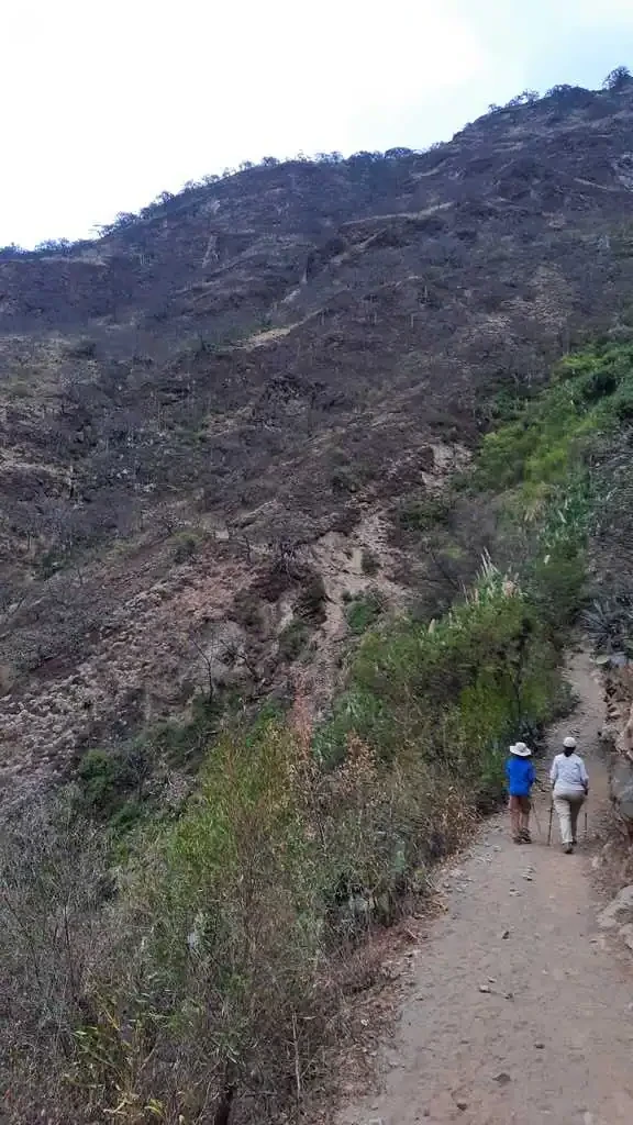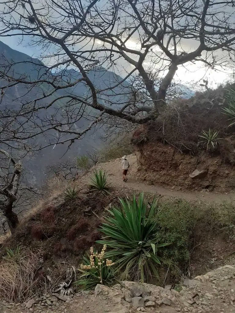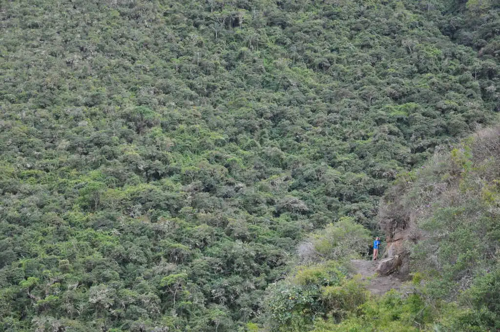 Jour 2 : on visite Choquequirao !! On pensait que ce serait une journée tranquille durant laquelle nos cuisses et mollets pourraient se reposer : absolument pas. Le cheval pour Sofia ne peut pas nous accompagner, le sentier est trop escarpé. Et en effet, la fin de la marche d’approche pour arriver sur le site à proprement parler n’est pas une balade de curiste. Ça monte et ça descend encore pas mal. La végétation change encore, c’est génial, on entre dans une forêt humide bien plus dense, où les arbres sont recouverts de nombreuses plantes épiphytes.